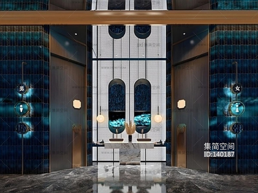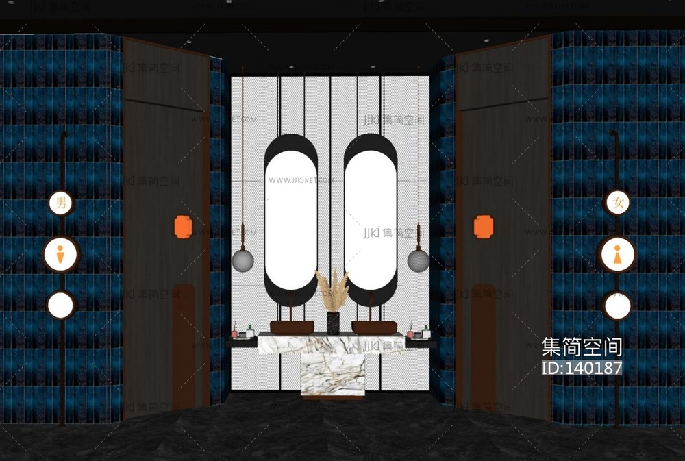 新中式公共卫生间小便器中式盆景隔断托盘SU模型su草图模型下载