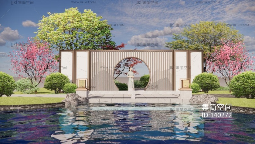 禅意新中式景墙隔断格栅水景 su草图模型下载