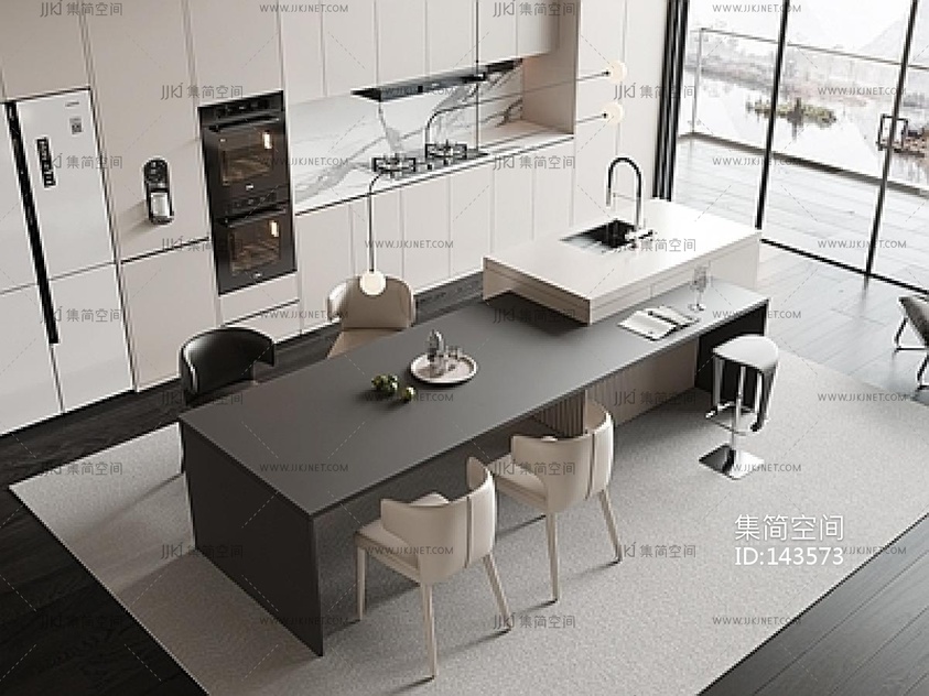 现代极简客餐厅_黑白灰客餐厅_高级灰客餐厅_吧台餐桌_开放式厨房_大平层横厅SU模型su草图模型下载