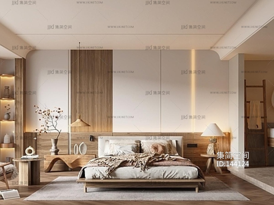 现代客房_双人床_原木客房日式客房双人床SU模型su草图模型下载