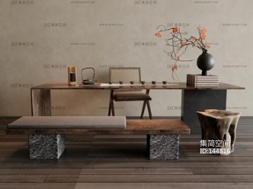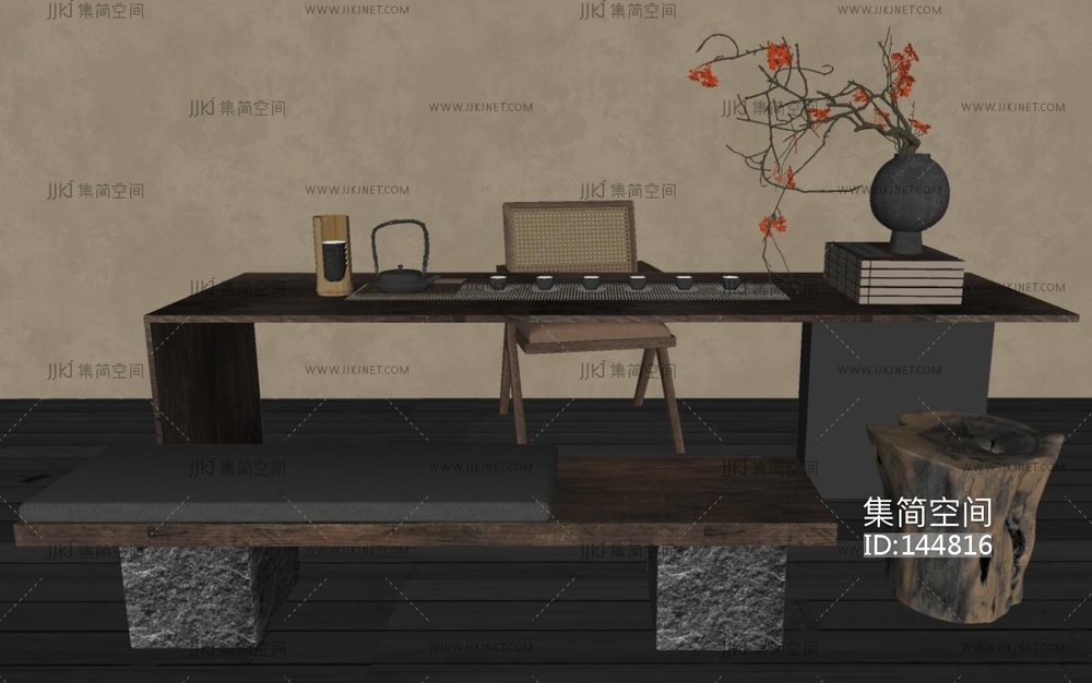 侘寂中古茶桌椅SU模型 su草图模型下载 [模型ID:144816]