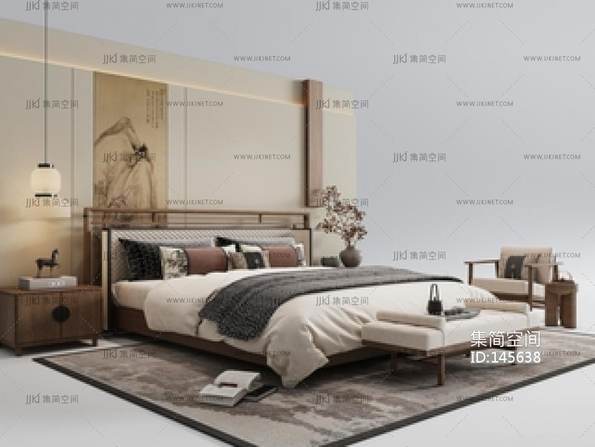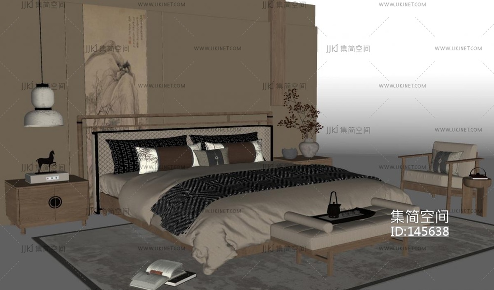 新中式禅意双人床具组合SU模型 su草图模型下载 [模型ID:145638]