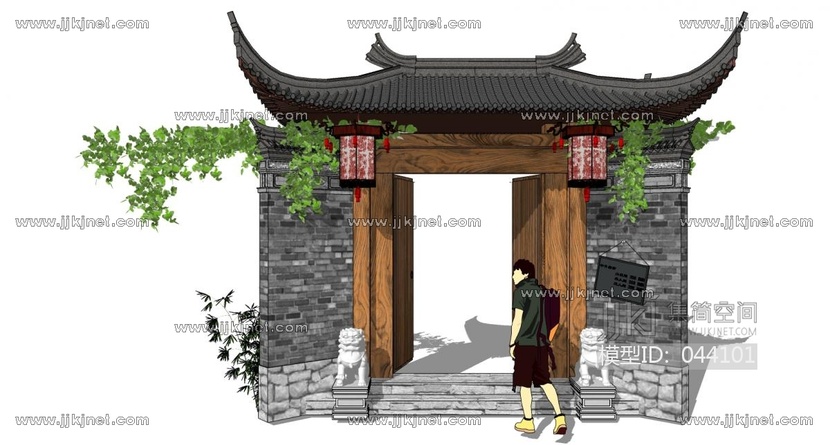 中式别墅庭院建筑大门门楼 院墙 门头 (6) su草图模型下载 [模型ID:44101]