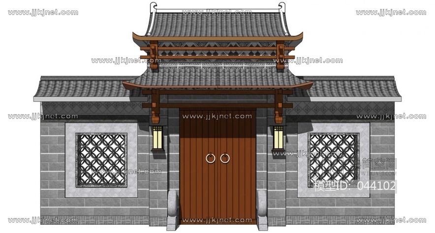中式别墅庭院建筑大门门楼 院墙 门头 (7) su草图模型下载 [模型ID:44102]
