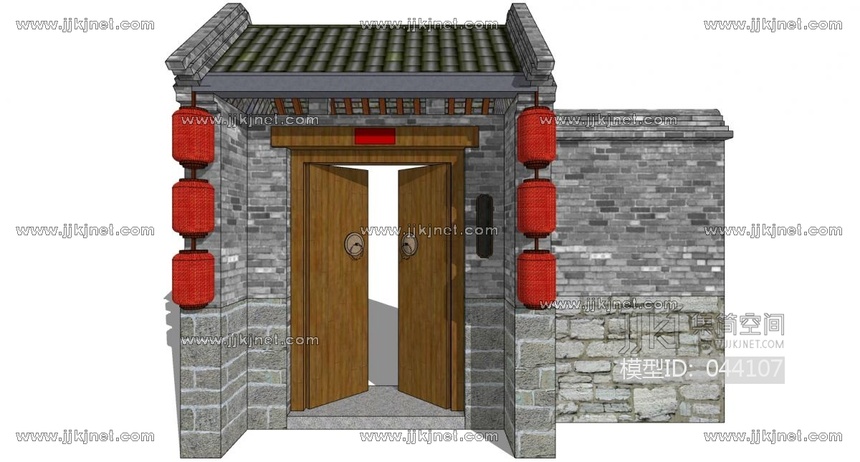 中式别墅庭院建筑大门门楼 院墙 门头(12) su草图模型下载 [模型ID:44107]