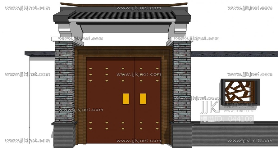 中式别墅庭院建筑大门门楼 院墙 门头(14) su草图模型下载 [模型ID:44109]