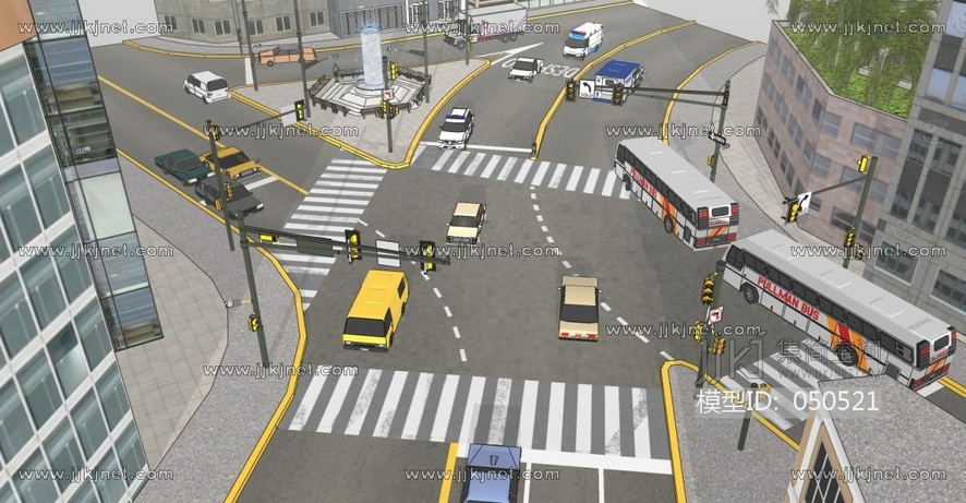 繁华道路景观路口交通信号灯红绿灯路灯车辆警车小汽车公交车斑马线路口指示标志路灯 (20) su草图模型下载 [模型ID:50521]