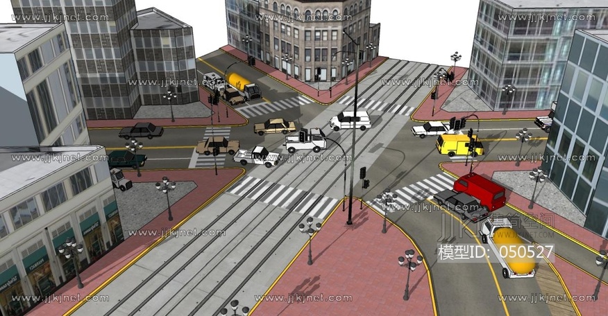 繁华道路景观路口交通信号灯红绿灯路灯车辆警车小汽车公交车斑马线路口指示标志路灯 (28) su草图模型下载 [模型ID:50527]