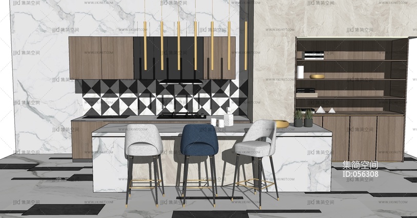 (1)北欧现代轻奢厨房橱柜吧椅中岛岛台灶具烟机吊柜 su草图模型下载 [模型ID:56308]