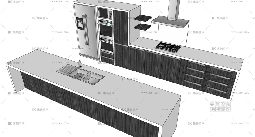 (20)现代简约橱柜厨房用具水槽冰箱吸油烟机烤箱微波炉燃气灶组合中岛岛台 su草图模型下载 [模型ID:56320]