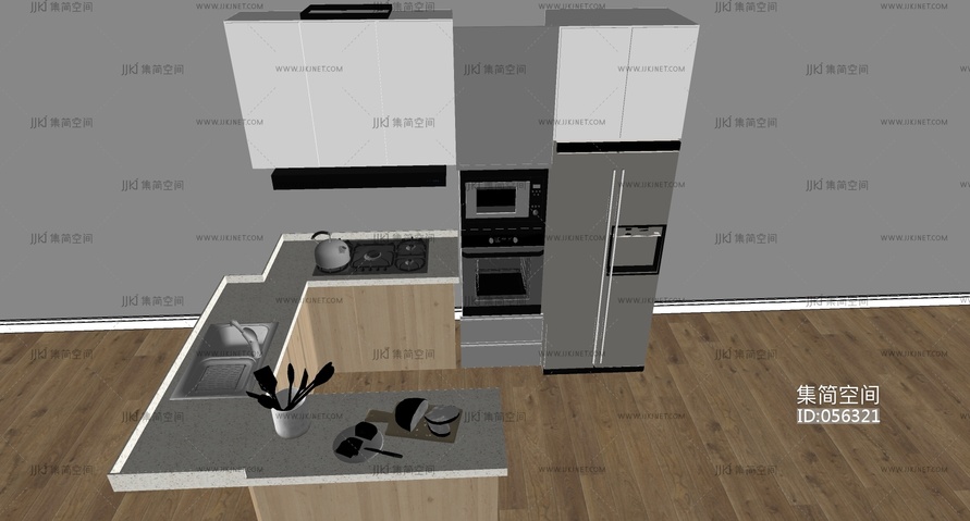 (15)现代简约橱柜水槽烤箱冰箱组合 su草图模型下载 [模型ID:56321]