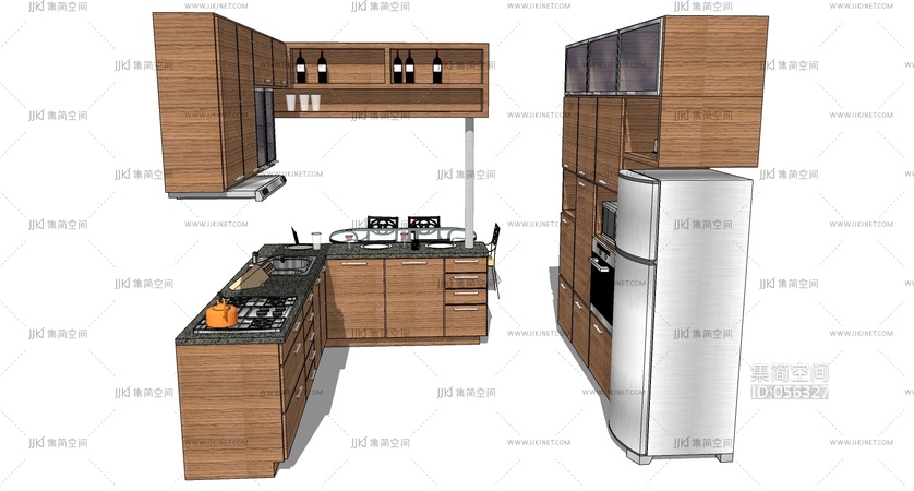 (5)现代木制简约橱柜厨房用具燃气灶水壶冰箱组合 su草图模型下载 [模型ID:56327]