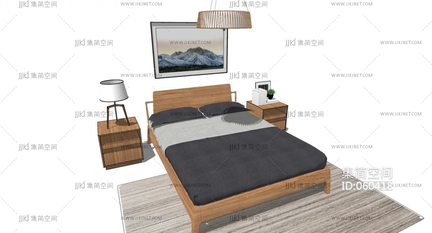 19日式北欧实木双人床床头柜台灯金属铁艺吊灯组合 su草图模型下载 [模型ID:60418]