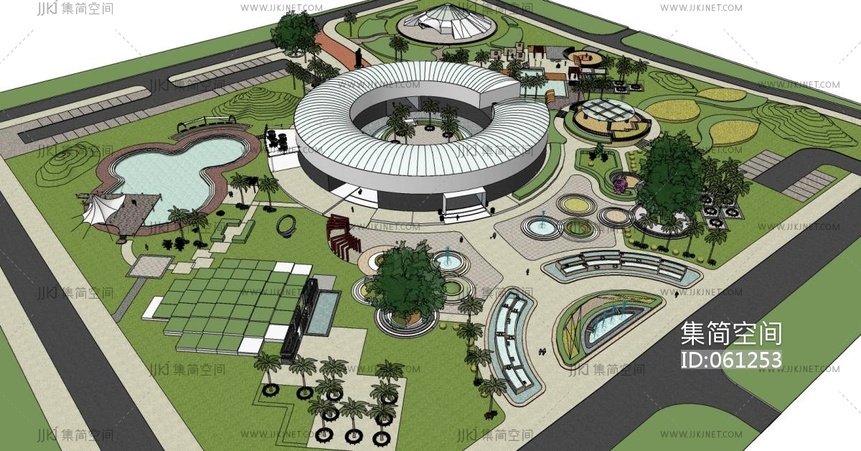 (73)景观园林规划树水景水池椰子树 su草图模型下载 [模型ID:61253]
