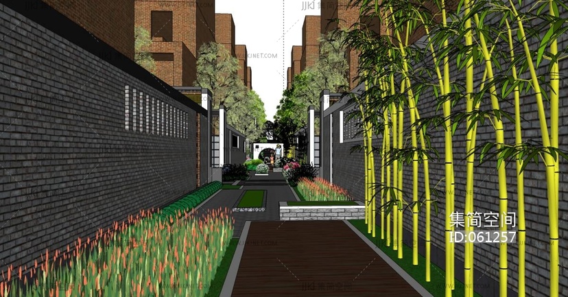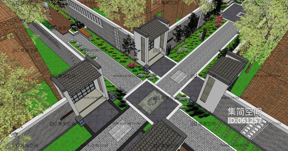 90中式古建大门路口景观花池竹子 su草图模型下载 [模型ID:61257]