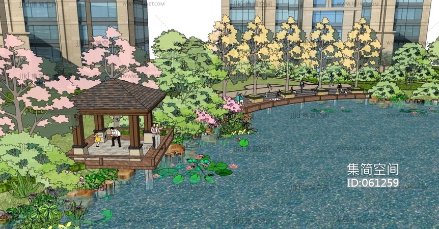 101住宅小区水景水系景观凉亭护栏荷花池树 su草图模型下载 [模型ID:61259]