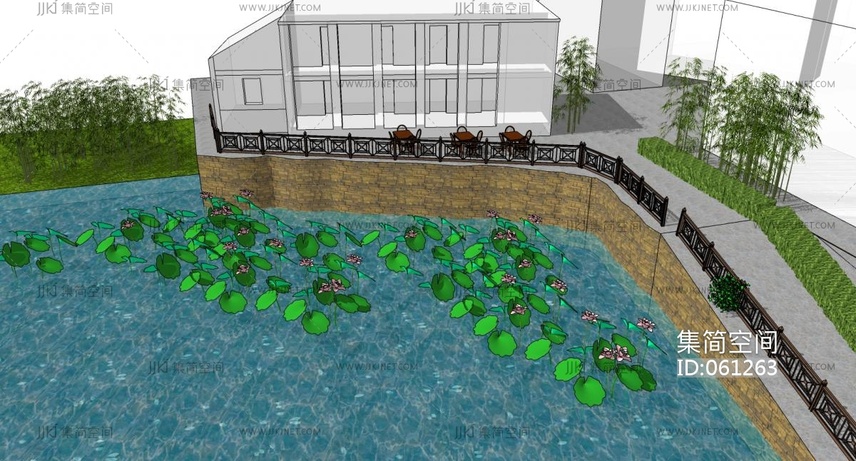 106中式木质护栏围栏水池水系荷花 su草图模型下载 [模型ID:61263]