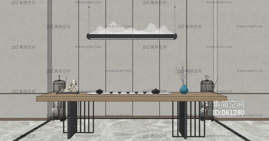 新中式茶桌椅子,茶具,山形状水晶吊灯茶桌椅 su草图模型下载 [模型ID:61280]