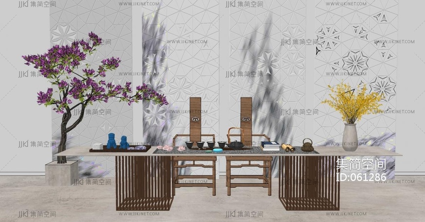 新中式茶桌椅,茶具盆景盆栽植物花瓶 su草图模型下载 [模型ID:61286]