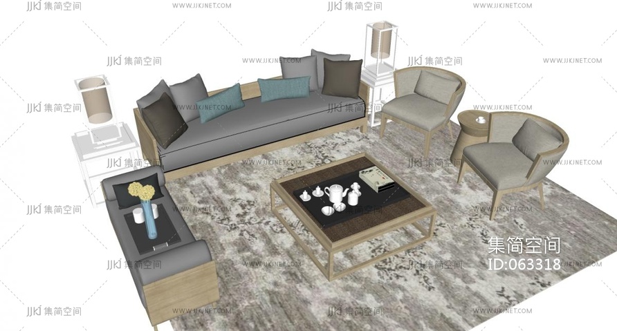 12新中式沙发茶几单人沙发椅子沙发榻茶具 su草图模型下载 [模型ID:63318]