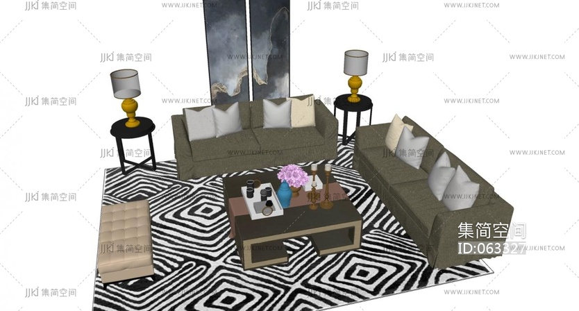 16现代双人沙发布艺椅子实木茶几沙发凳组合 su草图模型下载 [模型ID:63327]