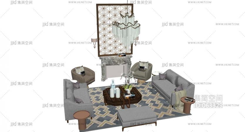 17简欧式美式沙发单人沙发茶几吊灯组合 su草图模型下载 [模型ID:63329]