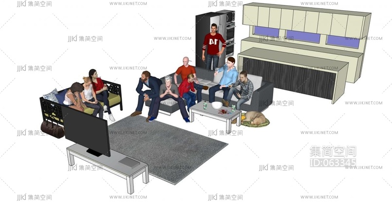 26现代简约多人布艺沙发实木双人沙发居家坐姿人物狗电视柜储物柜茶几组合坐着人物 su草图模型下载 [模型ID:63345]