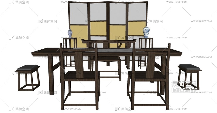 d41新中式书房书桌椅茶桌椅子屏风 su草图模型下载 [模型ID:64856]