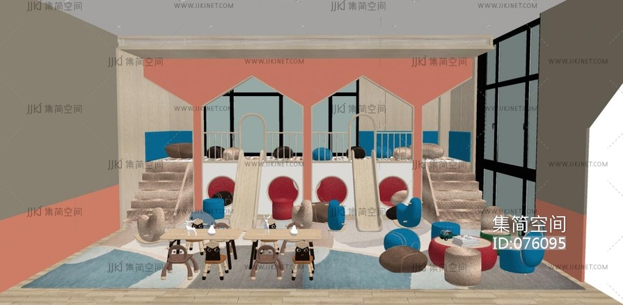 209现代儿童游乐区 儿童桌椅 儿童乐园 儿童滑梯 玩具 书柜 抱枕 su草图模型下载 [模型ID:76095]