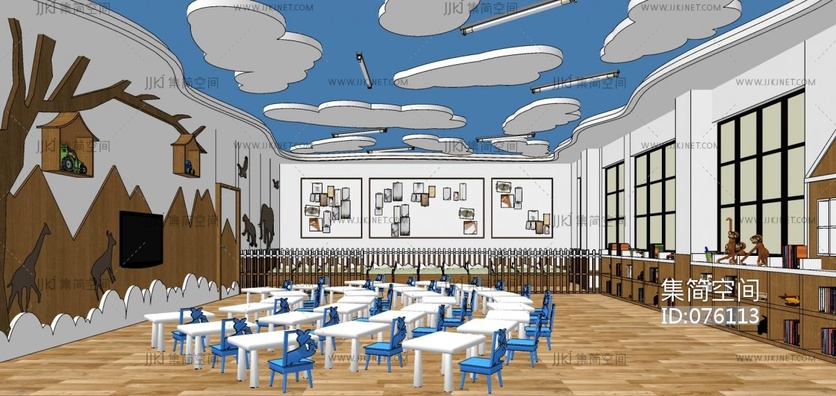 227现代幼儿园教室,活动室,读书阅览室,儿童桌椅,书柜,山形树木装饰墙 su草图模型下载 [模型ID:76113]