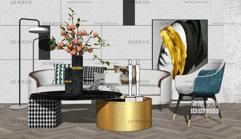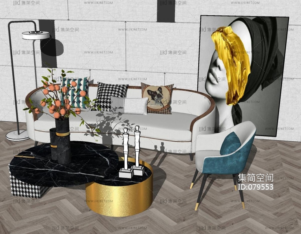 112现代轻奢新中式双人沙发 轻奢单人沙发 单椅 新中式家具组合 新中式多人布艺沙发 摆件 su草图模型下载 [模型ID:79553]