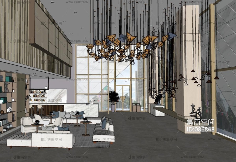 z14-0511现代售楼处,大堂大厅,沙发区,阅读区书柜水吧台,转角沙发,吊饰吊灯 su草图模型下载 [模型ID:86848]