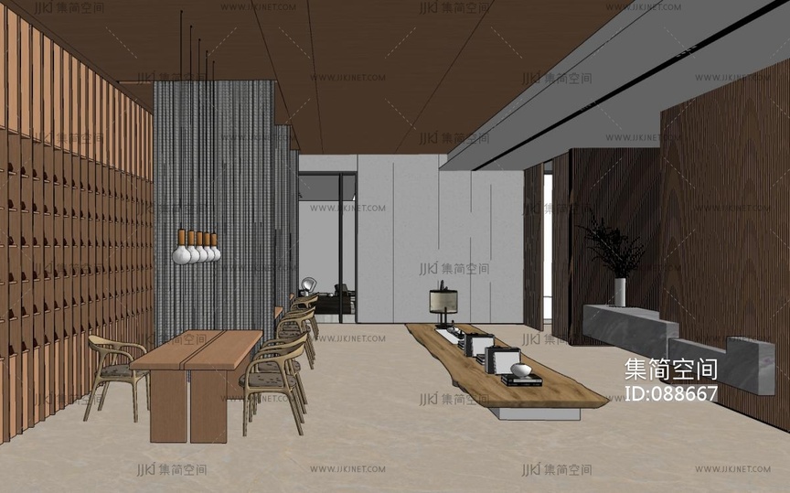 新中式禅意室内景观_景观造景_庭院景观_景观小品_天井室内景观_迎客松SU模型su草图模型下载