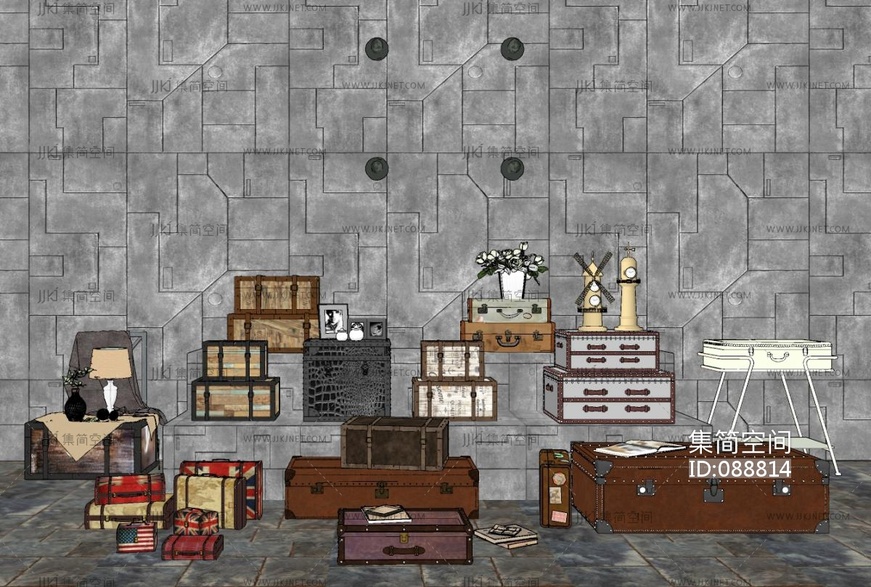 工业loft箱子,美式工业风橱窗,皮箱,手提箱,行李箱,木箱子 su草图模型下载 [模型ID:88814]
