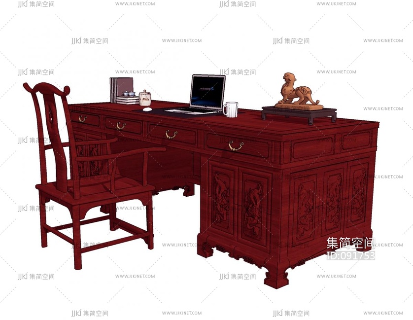 中式古典实木红木雕花书桌椅 su草图模型下载 [模型ID:91753]