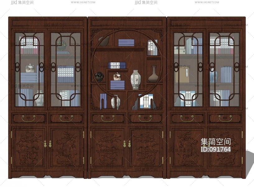 中式古典红木雕花书柜 su草图模型下载 [模型ID:91764]