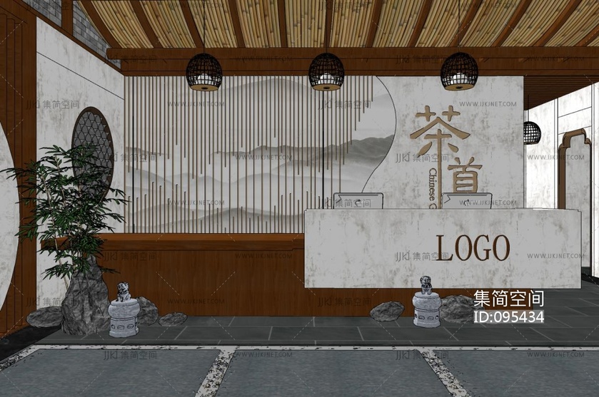 新中式茶馆,茶楼前台接待大厅 su草图模型下载 [模型ID:95434]