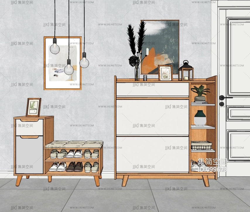 中古鞋柜_现代中古风鞋柜_换鞋凳_成品鞋柜_墙面挂件_花瓶花艺摆件SU模型su草图模型下载