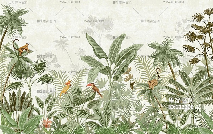 墙酷 现代东南亚热带植物动物绿色壁画 材质贴图下载