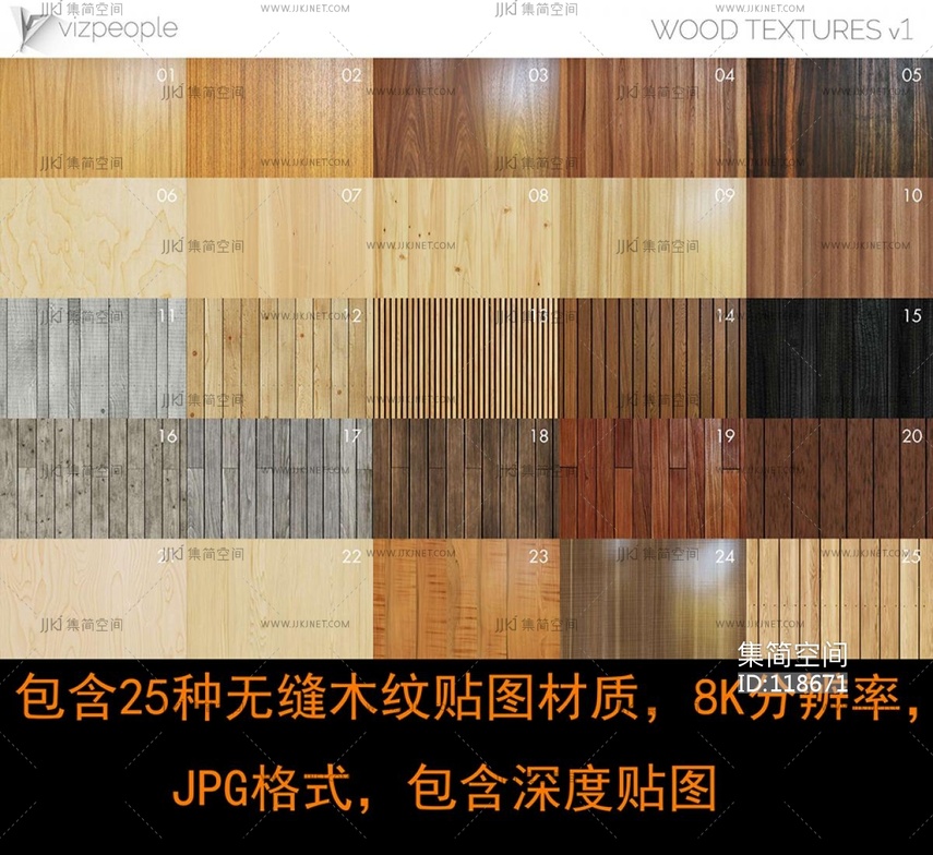 包含25中木纹贴图材质,8K分辨率,JPG格式,包含深度贴图